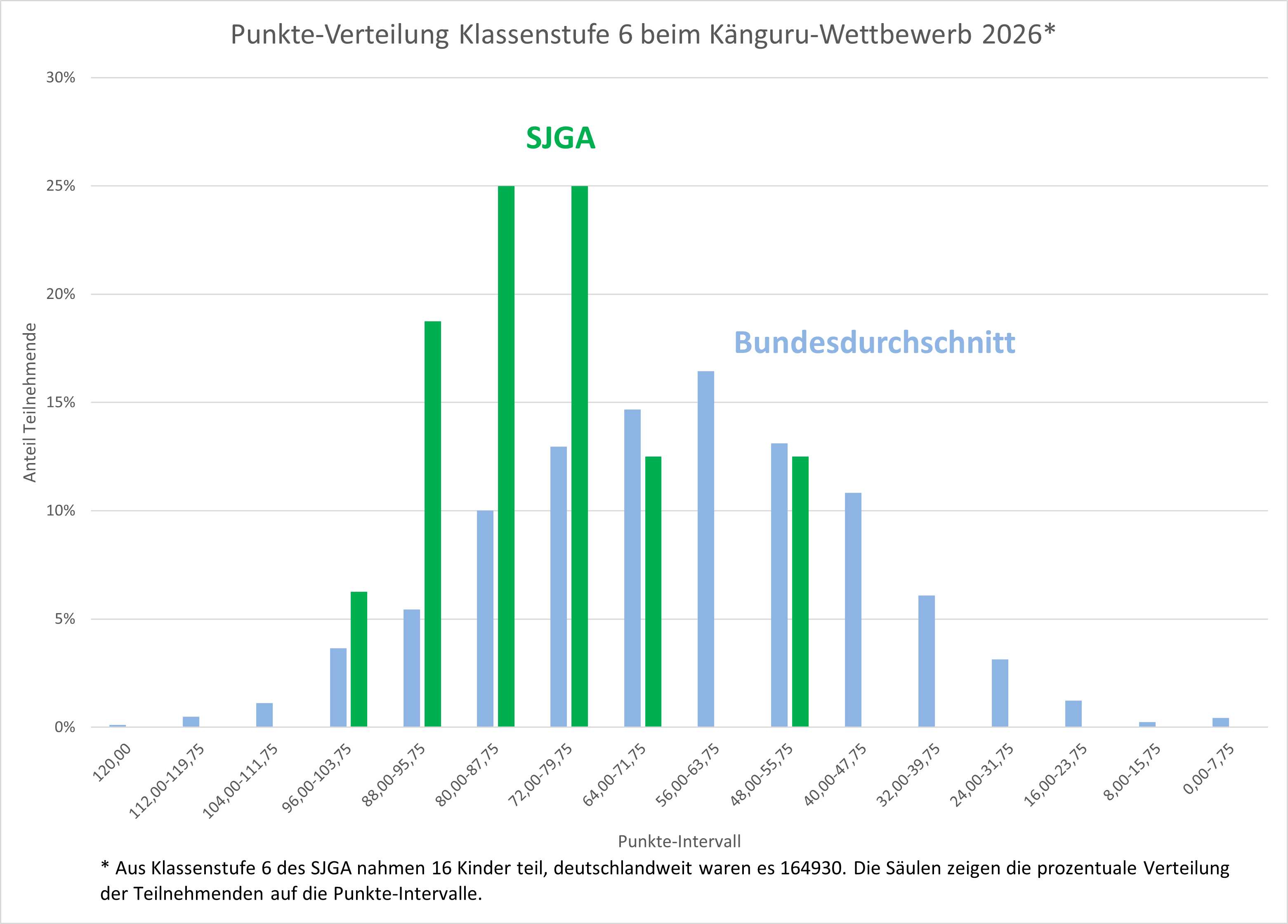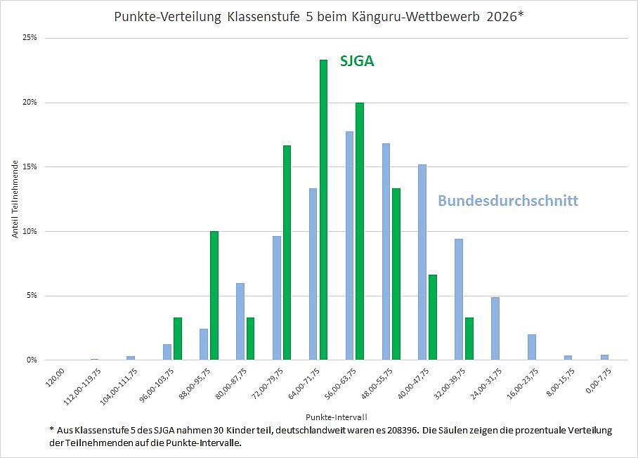 Lang haben wir auf das Paket mit den Urkunden und Preisen vom Känguru-Wettbewerb gewartet, bei dem unsere Schule im März seit Längerem wieder mitgemacht hat. Jetzt ist die Sendung aus Berlin angekommen, und wir konnten die Urkunden und Mitmach-Preise, das Kartenspiel KänguRudel, an alle Teilnehmenden verteilen. Wir freuen uns über die freiwillige Beteiligung von über 50 Schülerinnen und Schülern (siehe Foto) und sind stolz, dass sie im Ergebnis über dem Bundesdurchschnitt lagen (siehe Grafiken). Besonders erfreulich ist, dass einige Kinder dritte und sogar zweite Bundespreise erringen konnten – das ist wirklich eine tolle Leistung! Denn die Wettbewerbsaufgaben erfordern kreatives Herangehen und eigenständiges Denken. Wir hoffen, auch nächstes Jahr möglichst viele Kinder und Jugendliche zum Mitmachen motivieren zu können, und organisieren dafür auch gern wieder Vorbereitungstreffen.
